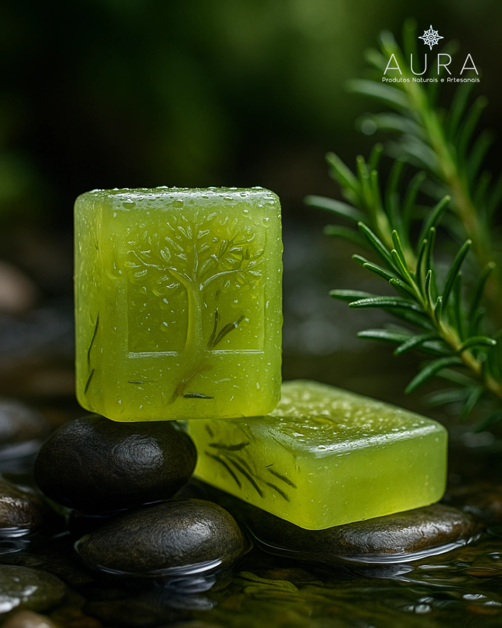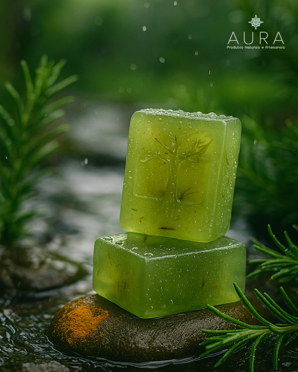 Um sabonete artesanal que combina extrato de alecrim e óleo essencial de hortelã pimenta. Refresca a pele enquanto combate micose, pano branco e mau cheiro nos pés e axilas, graças às suas propriedades fungicidas e bactericidas.
