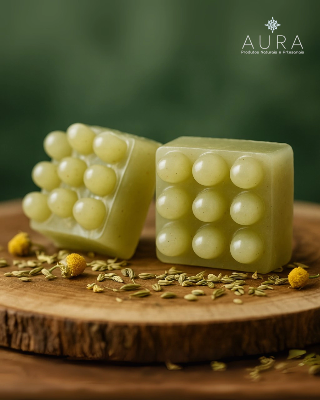 O nosso sabonete em formato massageador foi desenvolvido para transformar o seu banho em um momento de relaxamento e bem-estar. Sua fórmula é enriquecida com extrato de camomila, conhecido por suas propriedades calmantes, anti-inflamatórias e suavizantes, ideal para peles sensíveis ou irritadas. A camomila ajuda a reduzir vermelhidão, coceiras e promove uma sensação imediata de conforto.