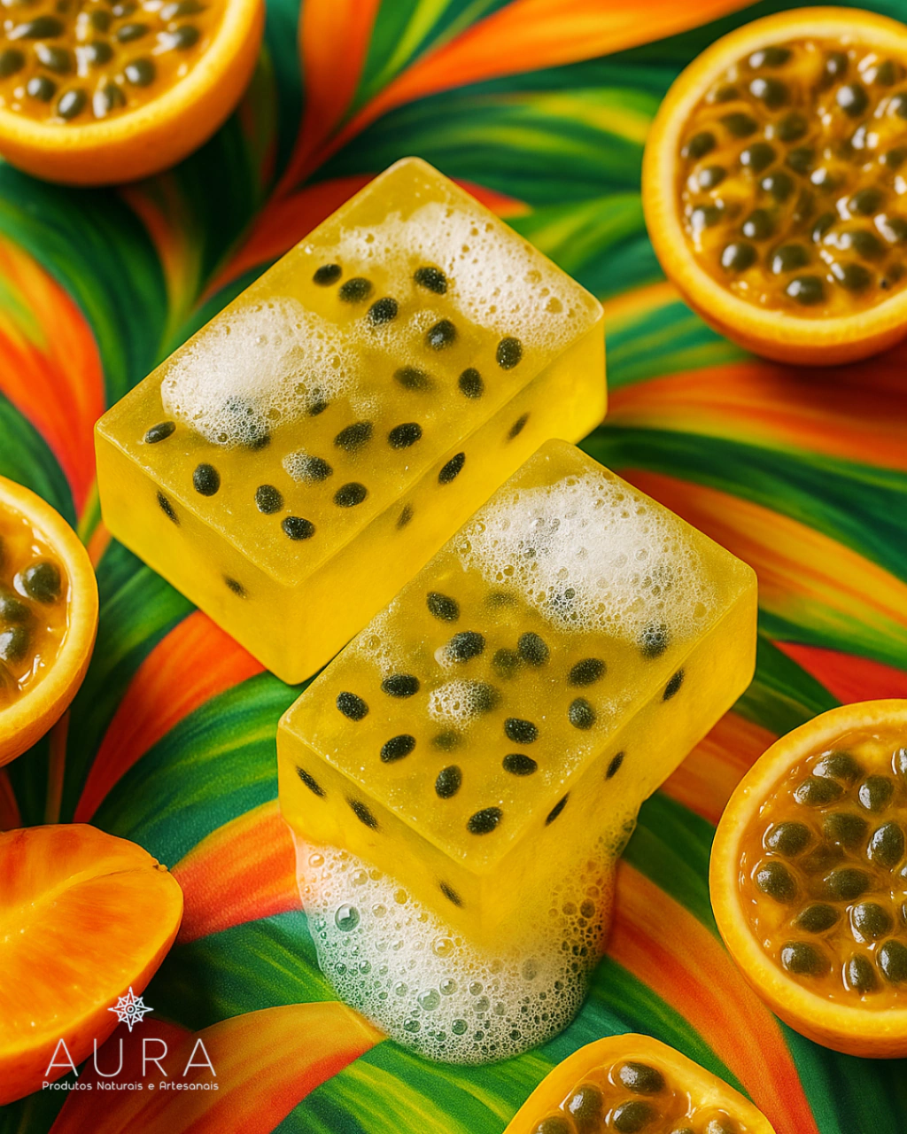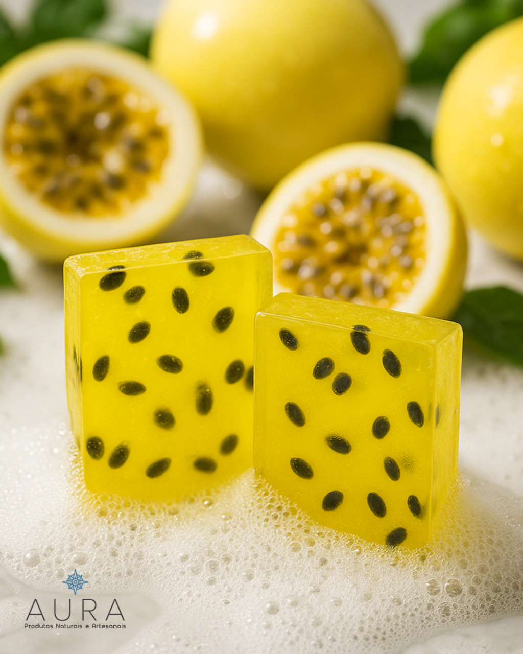 Descubra a magia do nosso Sabonete Vegetal de Maracujá! Com uma base glicerinada 100% VEGETAL, ele é mais do que um simples sabonete; é um verdadeiro ritual de bem-estar para sua pele.